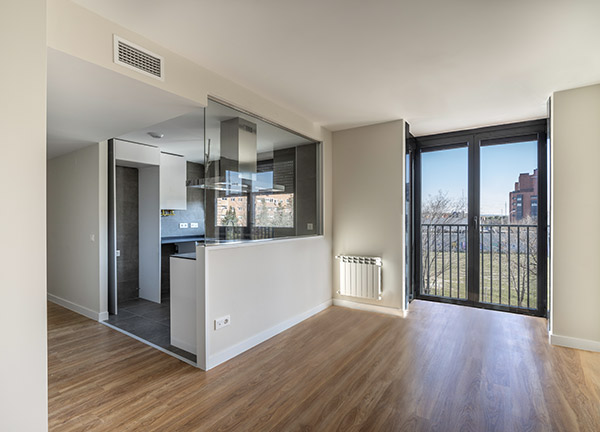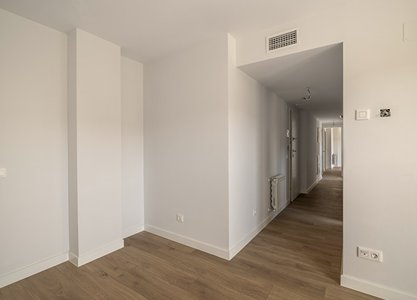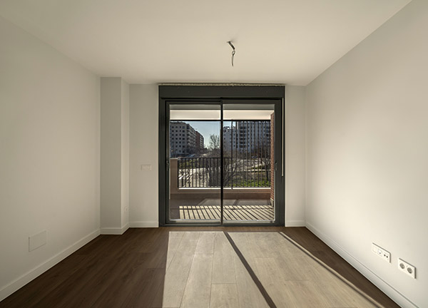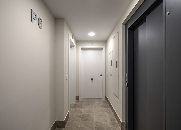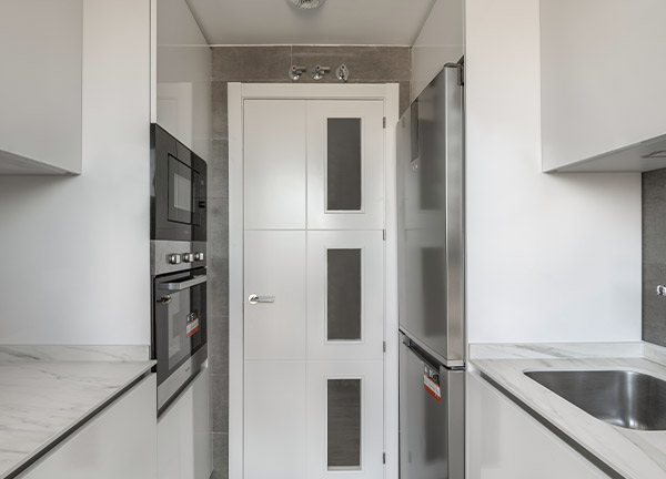 En madera acabada lacada en blanco, puertas con un plafón y herrajes cromados, la puerta de entrada a la vivienda blindada de 2030*825 lacada en color blanco modelo liso con dos fresados horizontales en ambas caras.
